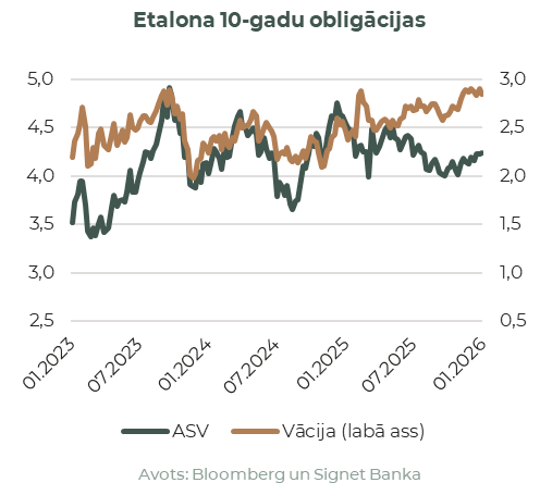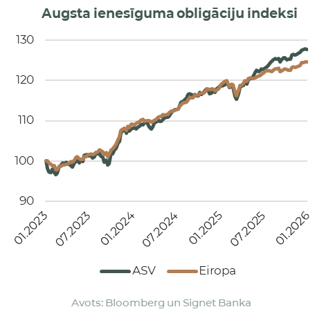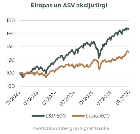 Janvāris aizritēja lielu ģeopolitisku satricinājuma zīmē – no ASV militārās operācijas Venecuēlā un Trampa draudiem Grenlandei līdz jauniem tarifiem Eiropai. Šo visu papildināja bažas par kārtējo ASV valdības dīkstāvi un neskaidrība ap jauno FRS priekšsēdētāju. Globālie akciju tirgi lielā mērā pārvarēja sākotnējos volatilitātes viļņus, ASV akciju indeksiem fiksējot mērenus pieaugumus: S&P 500 sasniedza vēsturisko 7 000 punktu robežu, noslēdzot janvārī ar 1,4% kāpumu, savukārt Nasdaq Composite pievienoja 1,0%. Eiropas akcijas turpināja apsteigt ASV kolēģus – STOXX 600 pieauga par 3,2%, ko veicināja pievilcīgākas sektoru valuācijas un stabili ekonomiskie rādītāji. Dārgmetālos turpinājās pēdējo desmitgažu iespaidīgākais rallijs, investoriem mērķtiecīgi meklējot patvērumu drošākos aktīvos (kas tagad drīzāk izskatās pēc agresīvās spekulācijas), lai gan mēneša beigās tie piedzīvoja pamatīgu korekciju. Turpretī bitkoina cena noslīdēja līdz BTC/USD 84’000.