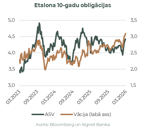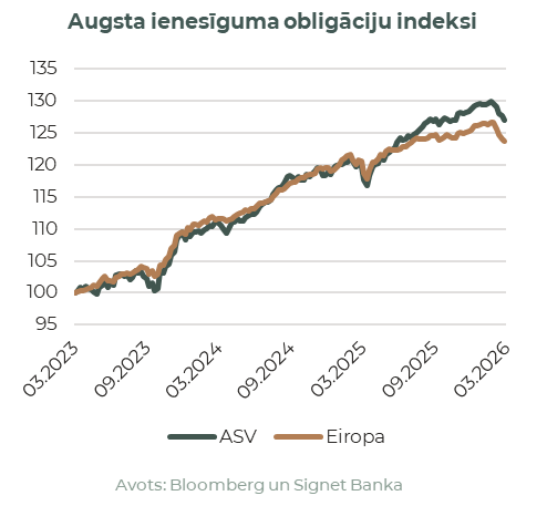 Obligāciju tirgi reaģēja ātri. ASV valsts obligāciju ienesīgums mēneša laikā strauji pieauga, un 10-gadīgo obligāciju ienesīgums sasniedza aptuveni 4,4%, kas ir tuvu augstākajam līmenim pēdējā pusgada laikā, investoriem samazinot cerības uz monetārās politikas mīkstināšanu. Pirms marta investori vēl koncentrējās uz procentu likmju samazinājumu tempu, bet mēneša beigās diskusijas jau bija pārvirzījušās uz to, cik ilgi monetārā politika varētu būt ierobežojoša, un vai inflācijas noturība varētu piespiest pat atjaunot stingrāku politiku. Vācijas valsts obligācijas kustējās tajā pašā virzienā, etalona 10-gadīgo ienesīgumam tuvojoties 3,0%.