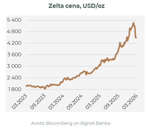 Izteikta marta iezīme bija tradicionālo “drošo patvērumu” aktīvu neparedzamā uzvedība. Neskatoties uz pieaugošiem ģeopolitiskajiem riskiem, zelta cena samazinājās par aptuveni 12%, kas liecina, ka, iespējams, šo kritumu izraisīja investoru pielāgošanās augošiem reāliem ienesīgumiem un ASV dolāra dominance, nevis ierastā zelta rezervju uzkrāšana piesardzības nolūkos. Pretēji vēsturiskajām tendencēm naftas cenu straujais kāpums neizraisīja masveida pieprasījumu pēc zelta. Līdzīgi arī bitkoins neizturēja “digitālā zelta” pārbaudi, šajā periodā neuzrādot ievērojamu cenas pieaugumu – tā vietā investori meklēja patvērumu ASV dolārā, kurš bija ļoti pieprasīts, EUR/USD kursam nostiprinoties ap 1,15, kas atspoguļo ASV ekonomikas noturību salīdzinājumā ar citām, energoatkarīgām valstīm.