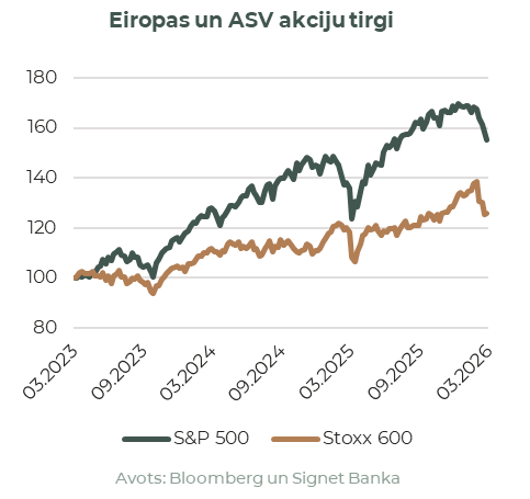 ASV akciju tirgi piedzīvoja plašu un vienlaicīgu lejupslīdi martā. S&P 500 indekss samazinājās par 5,1%, uzrādot sliktāko 1. ceturkšņa sniegumu kopš 2022. gada, savukārt Nasdaq Composite indekss nokritās par 4,8%. Šī nebija vienkārši korekcija esošo augsto valuāciju dēļ, bet gan kopējs risku pārvērtējums. Arī Dow Jones indekss, kas jau bija piedzīvojis desmit mēnešu ilgu uzvaras gājienu, samazinājās par 5,4%. Tādējādi investori novērsās no pozitīviem 2025. gada 4. ceturkšņa atskaišu sezonas rezultātiem un mākslīgā intelekta fokusa, kas kalpoja kā dzinējspēks gada sākumā. Diemžēl Eiropas akciju tirgos zaudējumi bija vēl izteiktāki. STOXX 600 indekss mēnesī saruka par 8,0%, kas ir sliktākais rādītājs kopš 2022. gada jūnija. Eiropa ir lielā mērā atkarīga no Tuvo Austrumu enerģijas importiem un ar mazākām iekšzemes rezervēm, kas reģionu padara neaizsargātu pret pieaugošajām izejvielu izmaksām. Enerģētikas sektors izcēlās kā vienīgais izņēmums, S&P 500 enerģētikas sektoram pieaugot par aptuveni 12%, un STOXX 600 naftas un gāzes indeksam kāpjot par 14,6%.