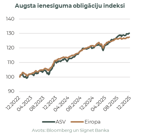 Neskatoties uz vairākiem volatilitātes viļņiem, visas galvenās aktīvu klases šogad uzrādīja iespaidīgus rezultātus, pat ja ASV akcijas zaudēja impulsu gada beigās. Jāpasaka, ka tās septiņus mēnešus pēc kārtas baudīja reti pieredzēto ralliju, kas Nasdaq indeksam beidzās novembrī, bet S&P 500 indeksam tikai decembrī. Tādējādi Nasdaq Composite 2025. gadā pieauga par 20%, bet S&P 500 indekss – par 16%, kas jau ir trešais gads pēc kārtas ar pieaugumu divciparu skaitļos. Eiropas indeksi turpināja pārspēt savus amerikāņu kolēģus, ko lielā mērā veicināja pievilcīgākas valuācijas – STOXX 600 indekss pieauga par 2,7% decembrī un par 36,7% (dolāru izteiksmē) 2025. gadā, arī noslēdzot trešo gadu ar divciparu pieaugumu.
