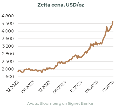Tikmēr ECB saglabāja procentu likmes nemainīgas, turpinot savu datu atkarīgo nostāju, neskatoties uz mērenajiem izaugsmes rādītājiem. Kā jau tika prognozēts, FRS decembra sanāksmē samazināja mērķa procentu likmi līdz 3,50–3,75% robežai, izraisot baumas par kvantitatīvās mīkstināšanas pasākumu turpināšanu. Dārgmetāli mēneša laikā strauji pieauga un turpināja sasniegt vēsturiski nebijušus augstumus, ko turpināja veicināt dolāra vājināšanās, centrālo banku pirkumi un ģeopolitiskā nenoteiktība.