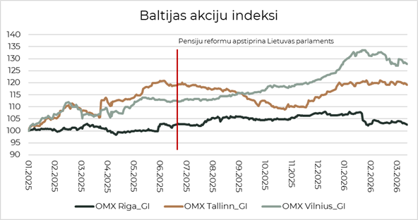 Pirmie izņemtie pensiju līdzekļi mājsaimniecību rīcībā nonāks jau aprīlī. Aplūkojot Baltijas akciju indeksu dinamiku, redzams, ka relatīvi labāko sniegumu demonstrē Lietuvas tirgus. Tas potenciāli var liecināt par investoru priekšlaicīgu uzpirkšanu, sagaidot, ka daļa no izņemtajiem pensiju līdzekļiem varētu tikt novirzīta tieši uz vietējo akciju tirgu.