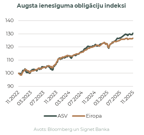 Eiropā “STOXX 600” indekss pakāpās par 0,8%, turpinot vairāku mēnešu ilgstošo pieauguma tendenci. Stabilu sniegumu uzrādīja finanšu sektors – “STOXX 600 Europe 600 Banks” indekss mēneša laikā pieauga par vairāk nekā 4%, jaunajam Lielbritānijas budžetam neparedzot jaunas nodevas aizdevējiem. Mazāk volatīli sektori kopumā uzrādīja labākus rezultātus, savukārt tehnoloģiju un aizsardzības sektoru akcijas atpalika globālās tehnoloģiju akciju izpārdošanas un Ukrainas miera sarunu atsākšanas dēļ. Tajā pašā laikā kriptovalūtas piedzīvoja strauju kritumu, BTC/USD kursam mēneša beigās noslīdot līdz aptuveni 90 tūkst. , likvidējot visu gada laikā uzkrāto pieaugumu.