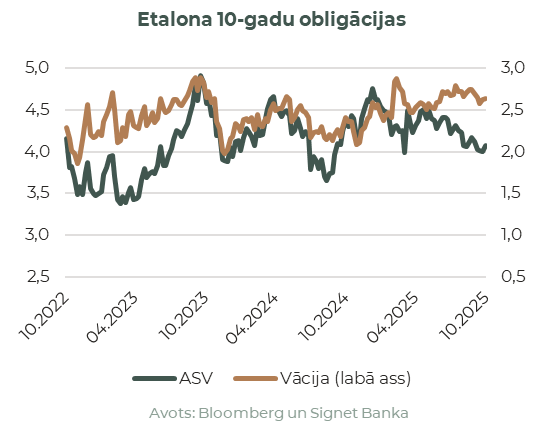 STOXX 600 mēneša laikā pieauga aptuveni par 2,5%, ko veicināja stabils Eiropas 3. ceturkšņa peļņas sezonas sākums, ņemot vērā Eiropas Centrālās bankas lēmumu saglabāt nemainīgas procentu likmes. Labu sniegumu uzrādīja tehnoloģiju, luksusa preču (LVMH vadībā), enerģētikas, veselības aprūpes un pārtikas un dzērienu nozares, savukārt derīgo izrakteņu ieguves un apdrošināšanas nozares uzrādīja vājākus rezultātus. Mēneša beigās Eiropas auto rūpniecības nozare piedzīvoja kāpumu pēc ziņām, ka “Nexperia” atsāks pusvadītāju piegādes no Ķīnas. Bitcoina cena pieauga līdz BTC/USD 125’000, tomēr mēneša laikā zaudēja 4,3%. Vērts atzīmēt, ka Bitcoina biržā tirgoti fondi palielināja savus Bitcoina krājumus par 3,5 mljrd. ASV dolāru, palielinot institucionālo turētāju daļu līdz 12% no kopējiem kriptovalūtas krājumiem.