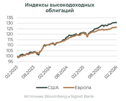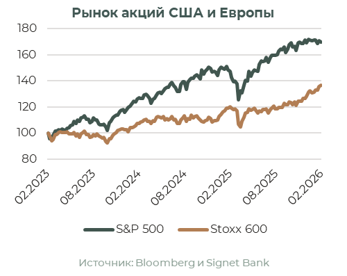 В течение месяца американские фондовые рынки демонстрировали разнонаправленную динамику, характеризовавшуюся резкими секторальными расхождениями. Индекс Nasdaq Composite снизился на 3,4% – худший месячный результат с марта 2025 года – под влиянием опасений относительно маржинальности ИИ-компаний и более высокой, чем ожидалось, инфляции, тогда как S&P 500 потерял 0,9%. В то же время DJIA вырос на 0,2%, кратковременно превысив отметку в 50 000 пунктов и зафиксировав десятый подряд месяц роста благодаря ротации капитала в устойчивые промышленные и энергетические компании. Европейские акции продолжили опережать американские: индекс STOXX 600 прибавил 3,7%, поскольку инвесторы искали защиту в более привлекательных оценках региона и меньшей подверженности рискам, связанным с американским технологическим сектором и тарифной политикой.