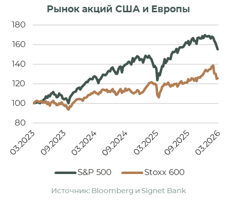 В марте на фондовых рынках США наблюдалось массовое и синхронное падение. Индекс S&P 500 снизился на 5,1%, продемонстрировав худшие результаты за первый квартал с 2022 года, а индекс Nasdaq Composite упал на 4,8%. Индекс DJIA, который до этого демонстрировал рост в течение десяти месяцев кряду, также снизился на 5,4%. Коррекция отражает более широкую переоценку перспектив роста и политической ситуации, поскольку инвесторы перестали ориентироваться на прибыли и безоблачное будущее для искусственного интеллекта, что поддерживало динамику рынка в начале года. В Европе падение было еще более ощутимым. Индекс STOXX 600 снизился на 8,0%, что стало худшим результатом с июня 2022 года, поскольку большая зависимость региона от импортируемых энергоносителей с Ближнего Востока и скудные внутренние резервы делают его уязвимым перед лицом растущих затрат на производственные ресурсы. Энергетика выделялась как единственная область роста: сектор энергетики S&P 500 прибавил примерно 12%, а индекс STOXX 600 Oil & Gas подскочил на 14,6%.