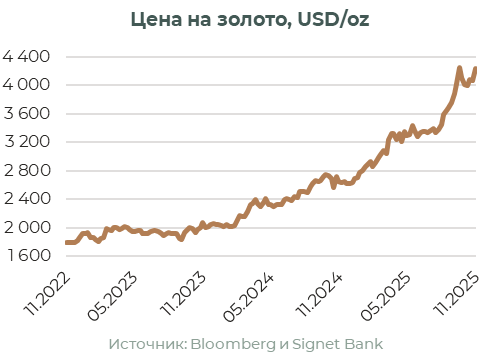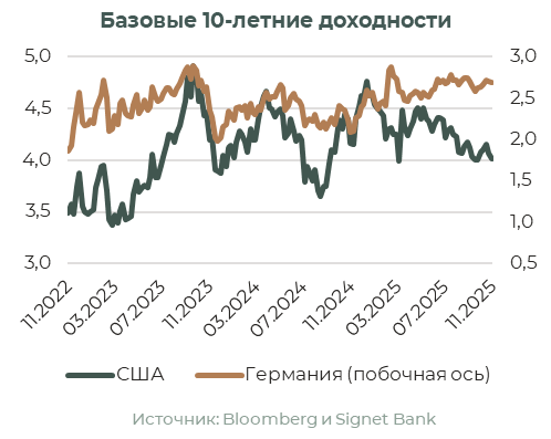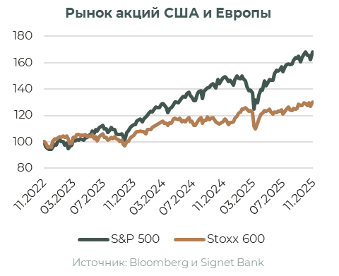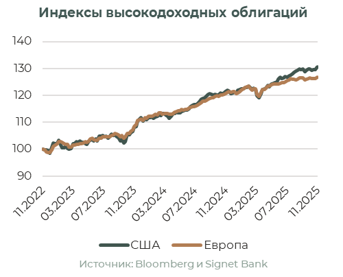 В Европе индекс STOXX 600 вырос примерно на 0,8% за месяц, продолжив свою многомесячную победную серию. Лидером роста стал финансовый сектор: индекс STOXX Europe 600 Banks подскочил более чем на 4% после того, как новый бюджет Великобритании избавил кредиторов от новых сборов. Защитные сектора в целом были более популярными в ноябре, в то время как акции технологических и оборонных компаний отставали на фоне глобального спада в технологическом секторе и возобновления мирных переговоров по Украине. Между тем, рынок криптовалют резко упал, а курс BTC/USD к концу месяца снизился до уровня около 90 000, стерев всю прибыль с начала года на фоне продолжающегося снижения толерантности к риску, вызванного повышенным уровнем закредитованности розничных инвесторов и ликвидационным давлением.