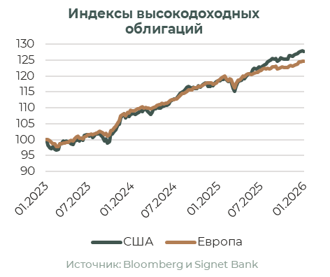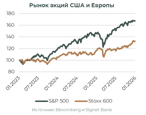 Январь начался с заметной волатильности на мировых фондовых рынках, вызванной в основном геополитической напряженностью, включая военную операцию США в Венесуэле, угрозы Трампа в адрес Гренландии, опасения по поводу новых тарифных войн, возможность очередного закрытия правительства США и неопределенность вокруг назначения нового председателя ФРС. Тем не менее индексы акций преодолели первоначальную нервозность и в конечном итоге продемонстрировали неплохой рост. Индекс S&P 500 достиг отметки в 7 000 пунктов и закрыл месяц с ростом на 1,4%, а индекс Nasdaq Composite вырос на 1,0%. Европейские индексы продолжали опережать свои американские аналоги, чему способствовали благоприятные отраслевые оценки и экономический импульс: индекс STOXX 600 вырос за этот период на 2,4%. Драгоценные металлы продолжили исторический рост, невиданный на протяжении десятилетий, а биткойн упал до 84 000 BTC/USD в конце месяца.