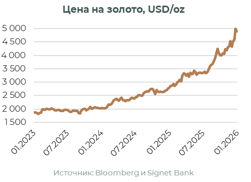 Драгоценные металлы пережили выдающийся рост, превысив все наши цели намного быстрее, чем ожидалось. Золото поднялось до рекордных максимумов выше 5600 XAU/USD, после чего в начале февраля произошел резкий откат к 4700 XAU/USD. Серебро продемонстрировало еще более взрывной рост, начав месяц вблизи 80 XAG/USD, поднявшись выше 120 XAG/USD в последнюю неделю января, а затем откатившись к ~75 USD за тройскую унцию.