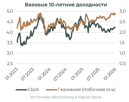 Повторная попытка президента Трампа в начале января приобрести Гренландию у Дании запустила переоценку геополитических рисков на финансовых рынках. На этот раз решение было мотивировано соображениями национальной безопасности в ответ на (неподтвержденное) усиление влияния России и Китая в Арктике. Ситуация обострилась 17 января угрозой введения тарифов против Дании и других европейских стран.