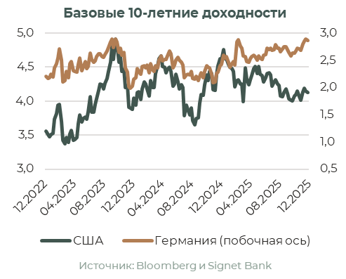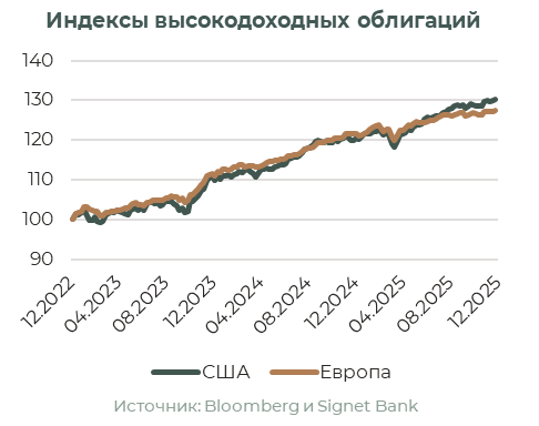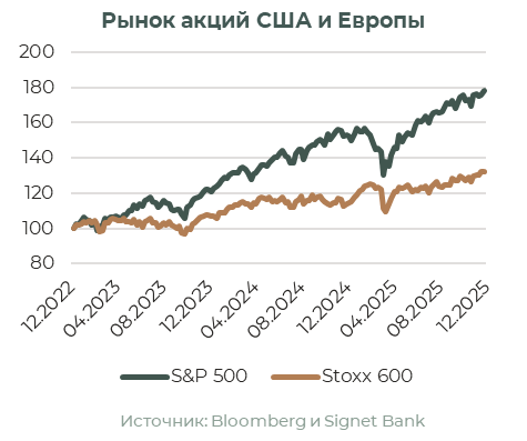 Несмотря на некоторую волатильность, наблюдавшуюся на протяжении 2025 года, мировые финансовые рынки продемонстрировали впечатляющий годовой рост «по всей доске», даже несмотря на то, что в декабре американский фондовый рынок потерял в динамике на фоне фиксации прибыли и продолжающейся ротации в сторону защитных секторов. Напомним, что американские акции привлекли к себе внимание семимесячным ралли, которое закончилось для Nasdaq Composite лишь в ноябре, а для S&P 500 в декабре. Nasdaq Composite вырос на 20% в 2025 году, а S&P 500 – на 16%, отметив третий год двузначного роста подряд. Европейские индексы показали даже лучшую динамику – STOXX 600 вырос на 2,7% за месяц и на 36,7% (в долларовом выражении) за 2025 год, также завершив третий год подряд двузначным ростом.