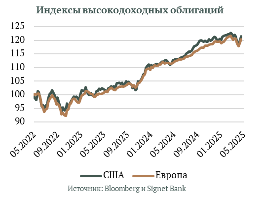 17 апреля ЕЦБ снизил депозитную ставку и ставку РЕПО на 25 базисных пунктов до 2,25% и 2,40% соответственно, что стало седьмым снижением за год, реагируя на ослабление роста экономики и снижение инфляционного давления. 7 мая ФРС в третий раз оставила ставки на уровне 4,25-4,50%, ссылаясь на инфляцию и риски для рынка труда, при этом Пауэлл высказался за осторожный и основанный на данных подход к дальнейшим решениям. Доходность 10-летних казначейских облигаций США достигла минимума в 3,99% 4 апреля, а к концу месяца составила 4,18%, в то время как доходность 10-летних облигаций Германии упала с 2,68% 9 апреля до 2,44%.